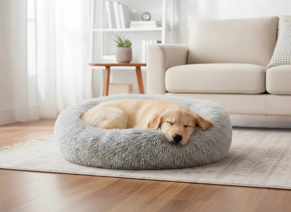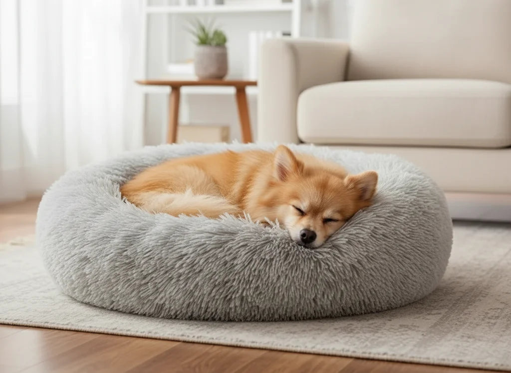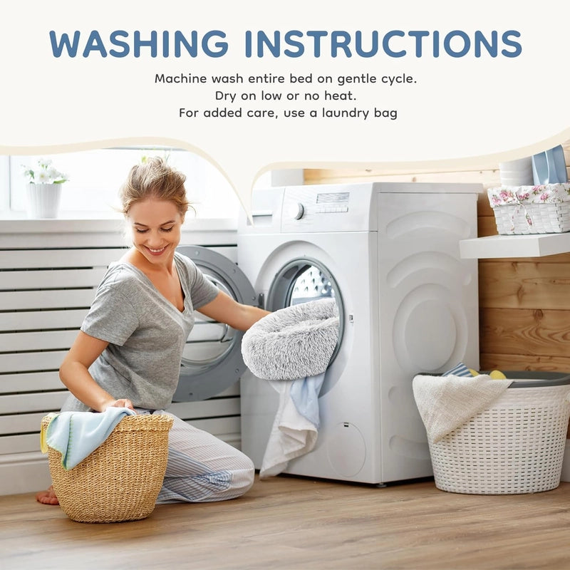The bed combines a supportive donut fill, soft faux-fur surface, and raised rim to provide gentle pressure and a sense of security — similar to being snuggled. This reduces anxiety, encourages restful curling-up, and improves sleep quality. It’s also machine-washable and has a non-slip, waterproof bottom for easy care.